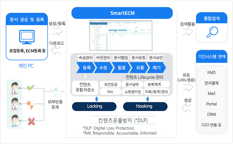 SmartECM은 문서중앙화를 통해 개인문서를 회사 자산화하고 문서활용과 문서보안을 강화하여 일하는 방식을 개선시키는 혁신적인 기업형 ECM 솔루션입니다.